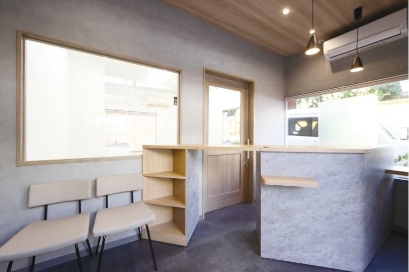 2025年5月に竣工。木を多用したナチュラルモダンをコンセプトに、温かみのある空間に仕上げました。カウンター側面には斜めの木目を使用し、受付が空間のアクセントになるようなデザインを取り入れました。