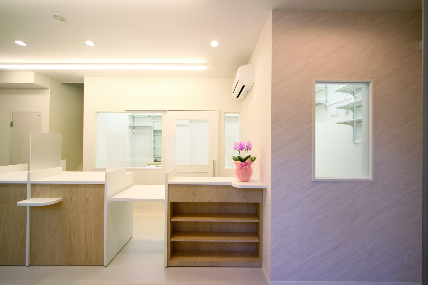 お子様からお年寄りまでさまざまな患者様が来られるということで、調剤室から待合室の様子が見られるよう、透し面を多く設けました。