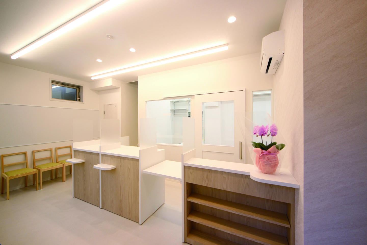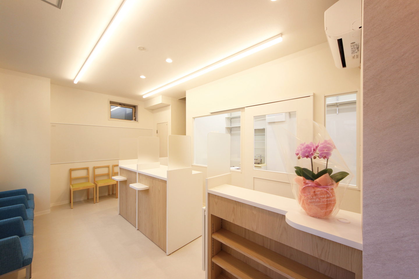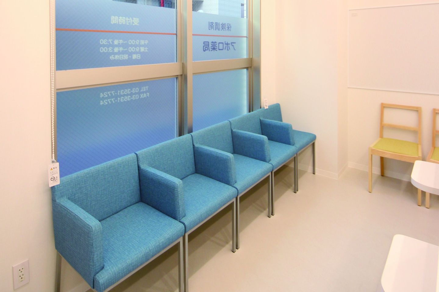 狭小テナントだったので、スペースを最大限活用できるよう片肘の椅子を採用し、お年寄りの患者様も立ち上がりやすい座面高さとしました。