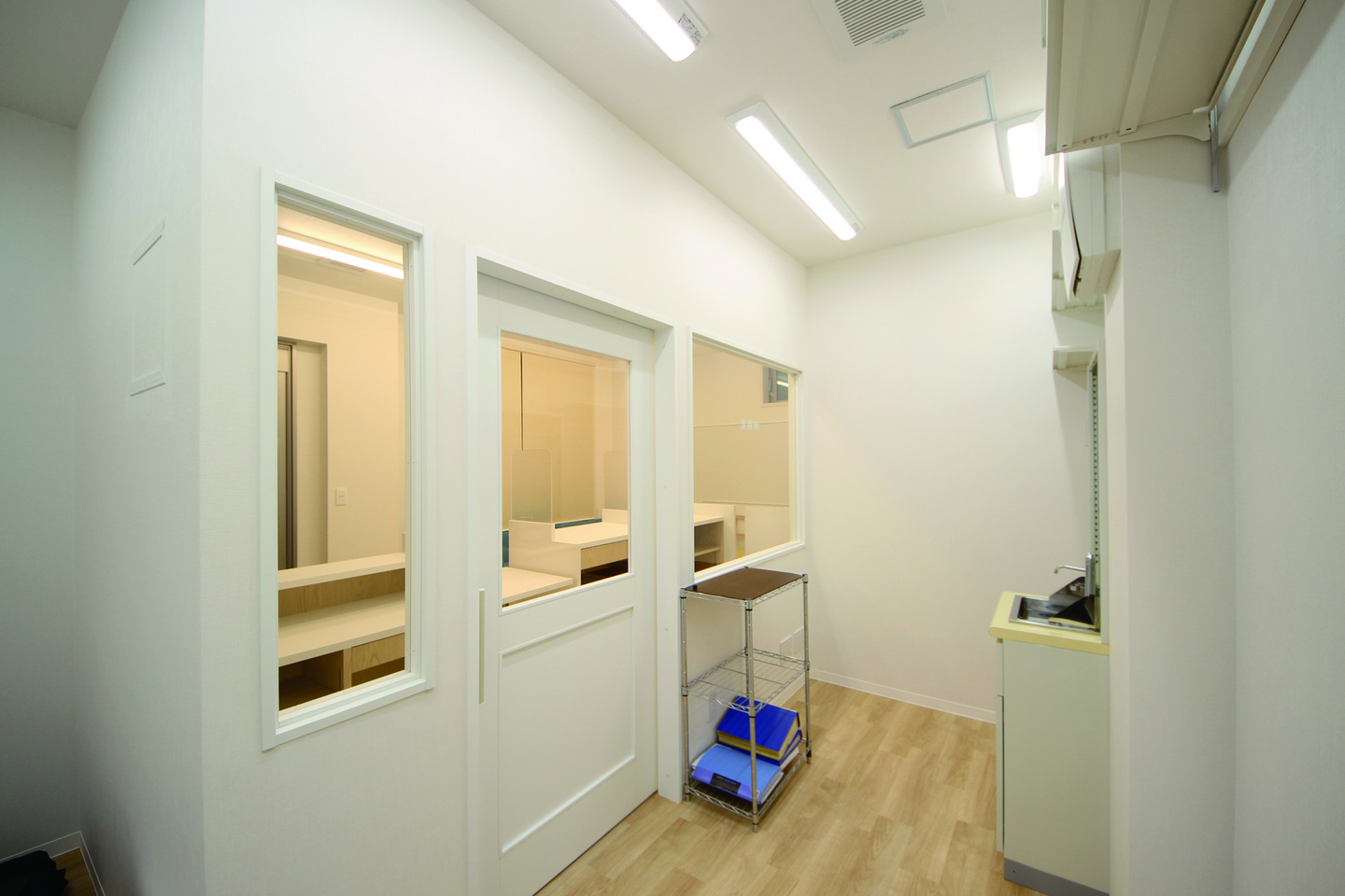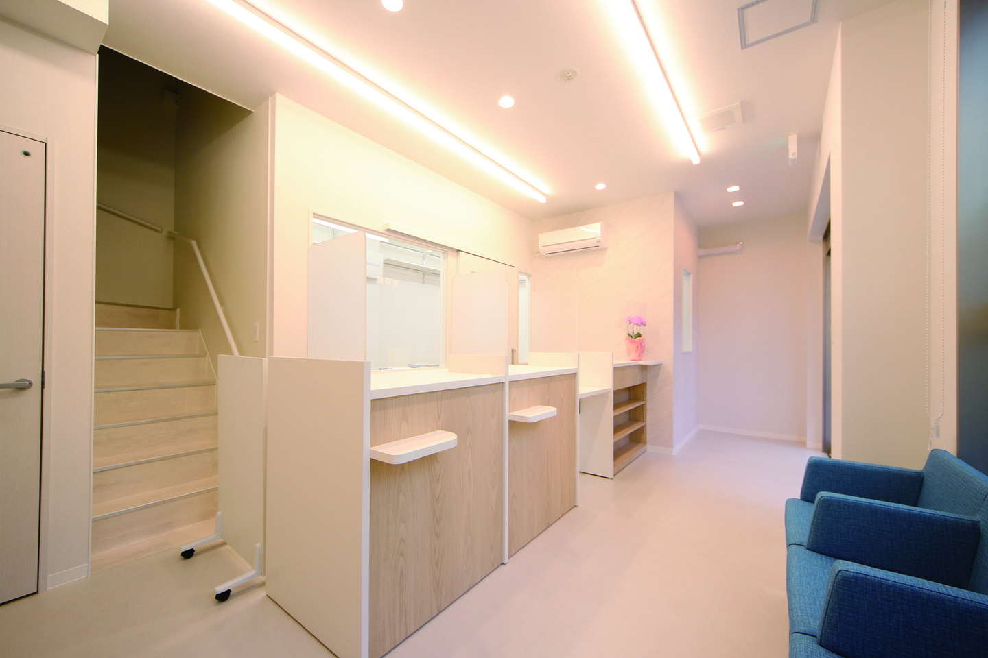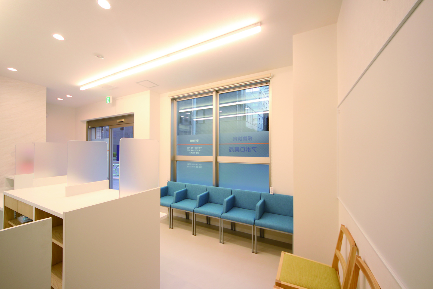 狭小テナントだったので、スペースを最大限活用できるよう片肘の椅子を採用し、お年寄りの患者様も立ち上がりやすい座面高さとしました。
