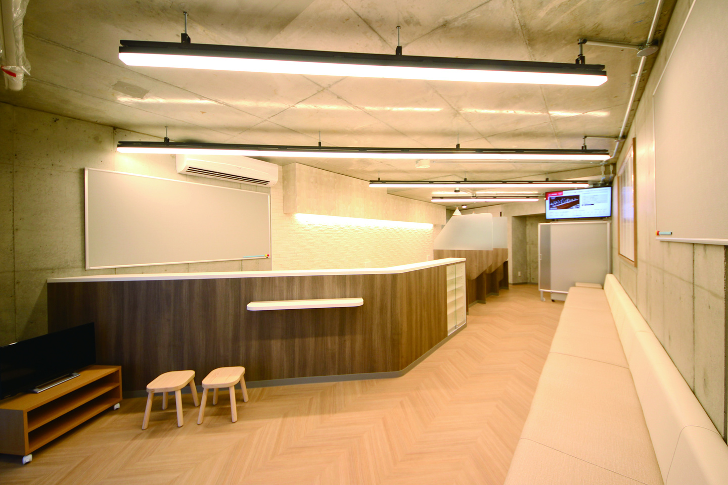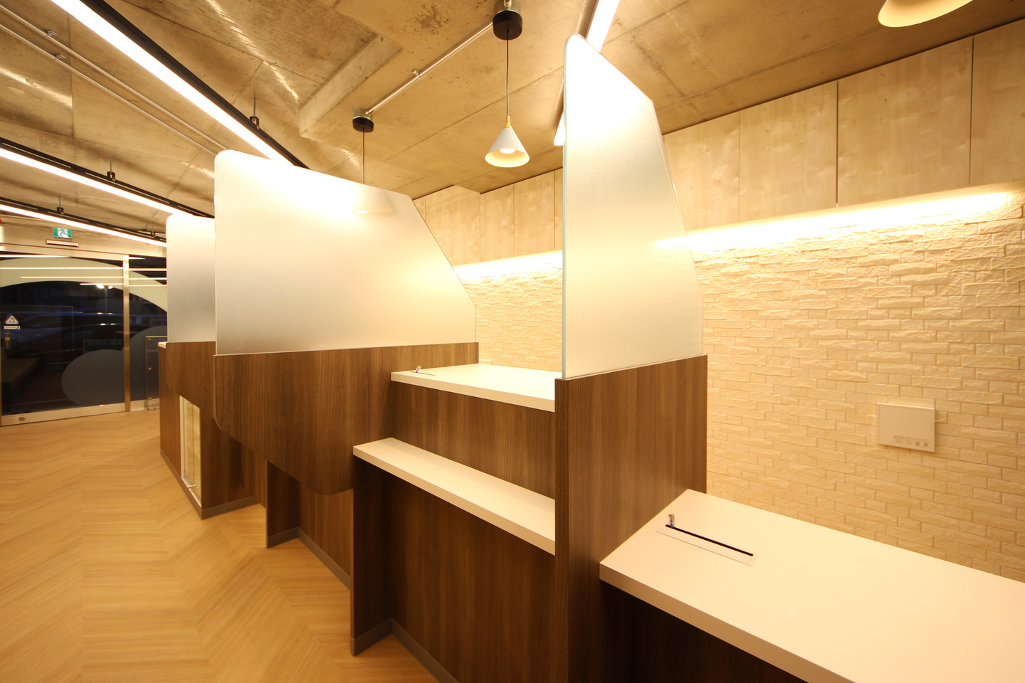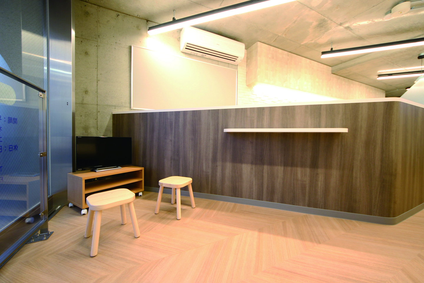 受付バックには、エコカラットタイルを使用し、暗くなりがちなRC仕上げを緩和し、たまりやすい湿気の調整もできるようにしました。