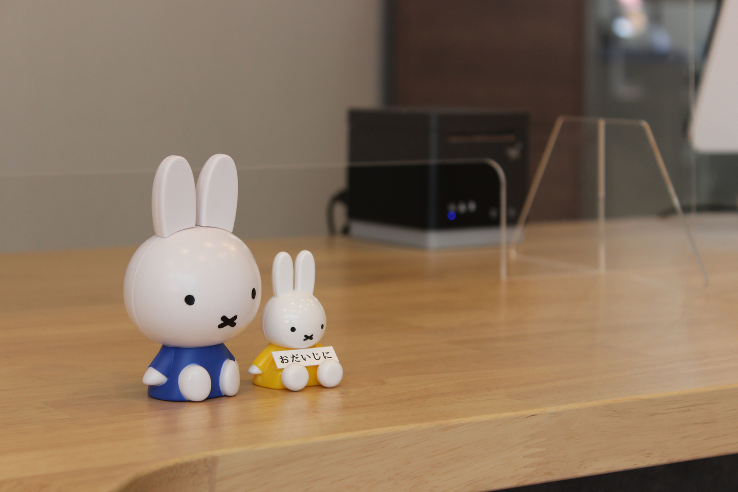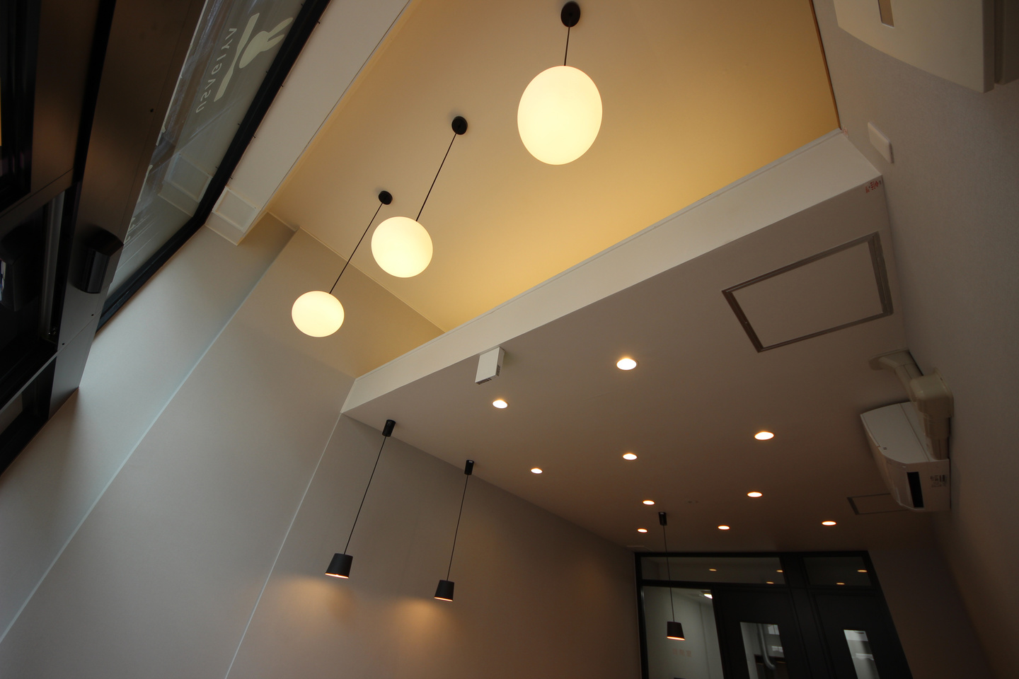 薬局うさぎやというかわいらしい名称と合わせた、間接照明と丸いペンダントライトの組み合わせで、雰囲気を出しました。