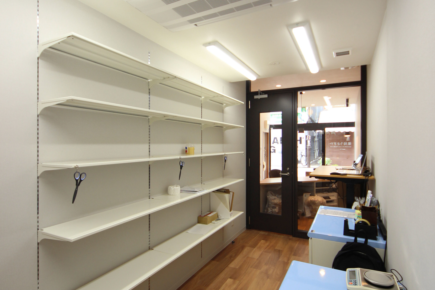 調剤室の壁にはスチールパーティションを用い、奥行を感じられるよう計画し、受付・投薬カウンターと待合カウンターを組み合わせた造作カウンターを設けました。