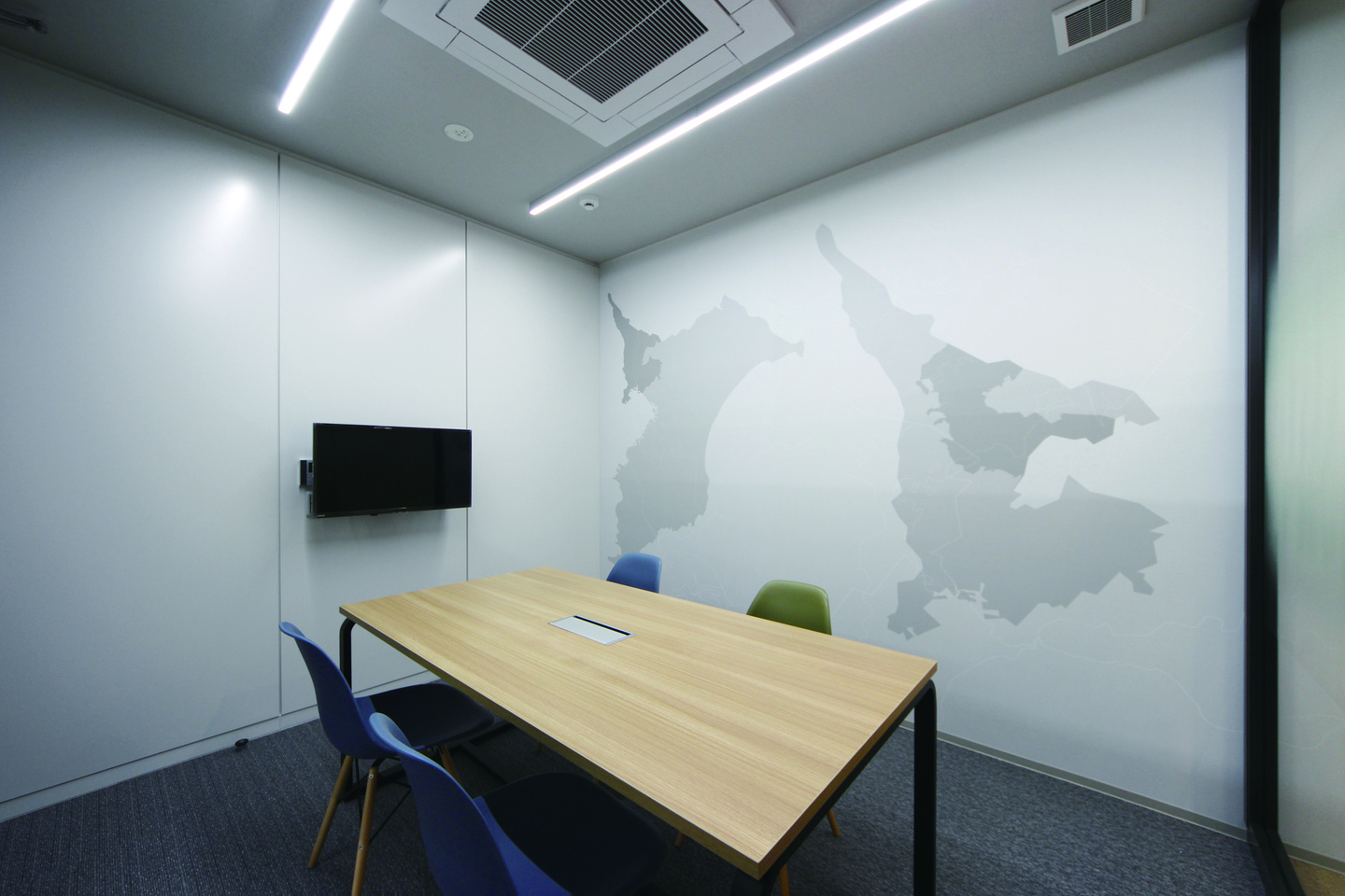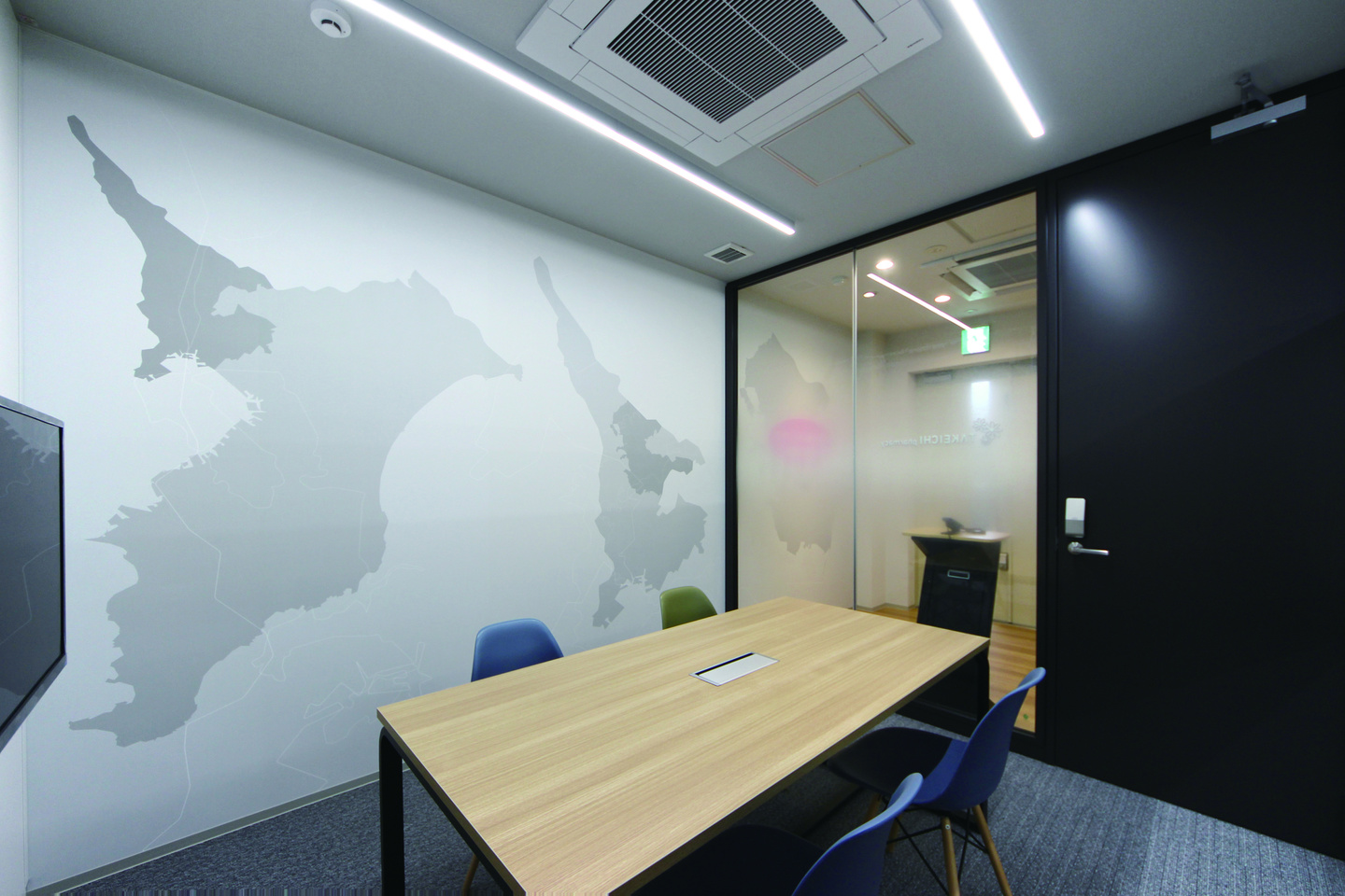 受付のグラフィックウォールは会議室までひとつなぎにし、空間に連続性を持たせました。