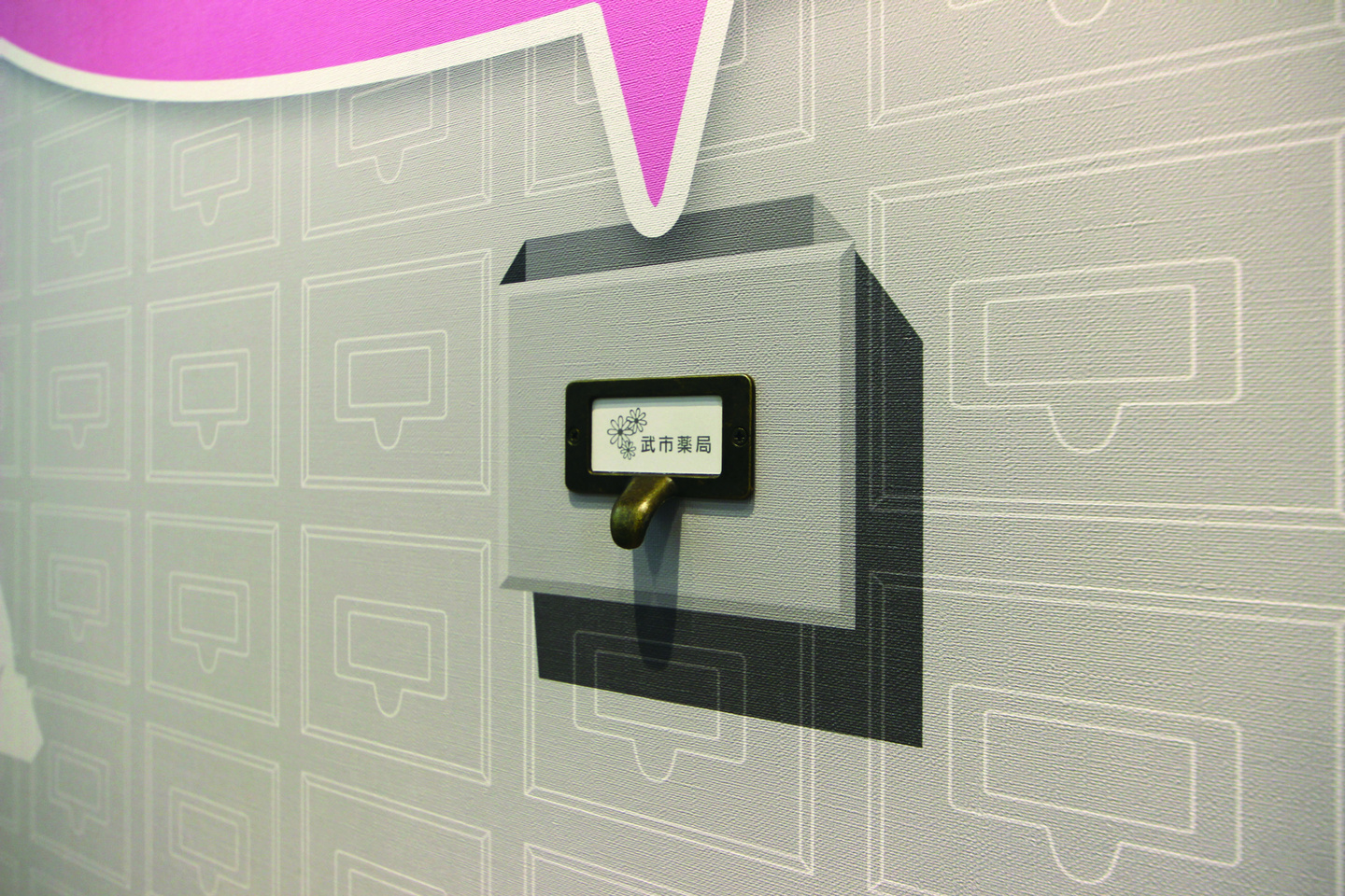 グラフィックウォールのデザインは施主様のアイデアで、千葉の地図の形と昔の薬棚を連想させるパターンを組み合わせ、地元から幅広い地域へ薬を届けるという意味が込められています。