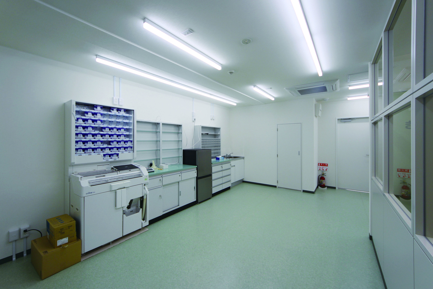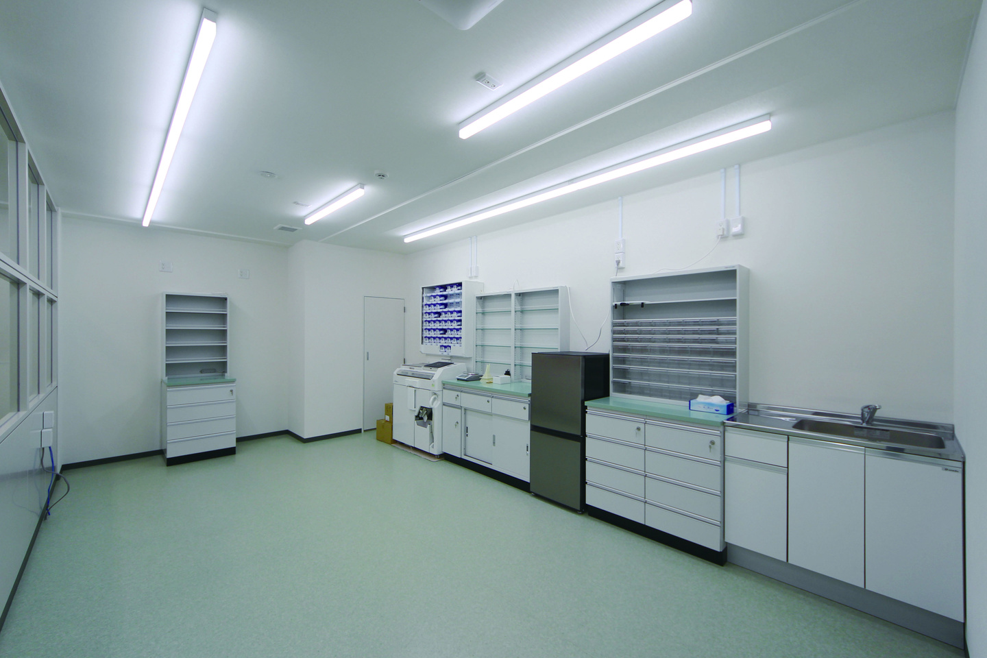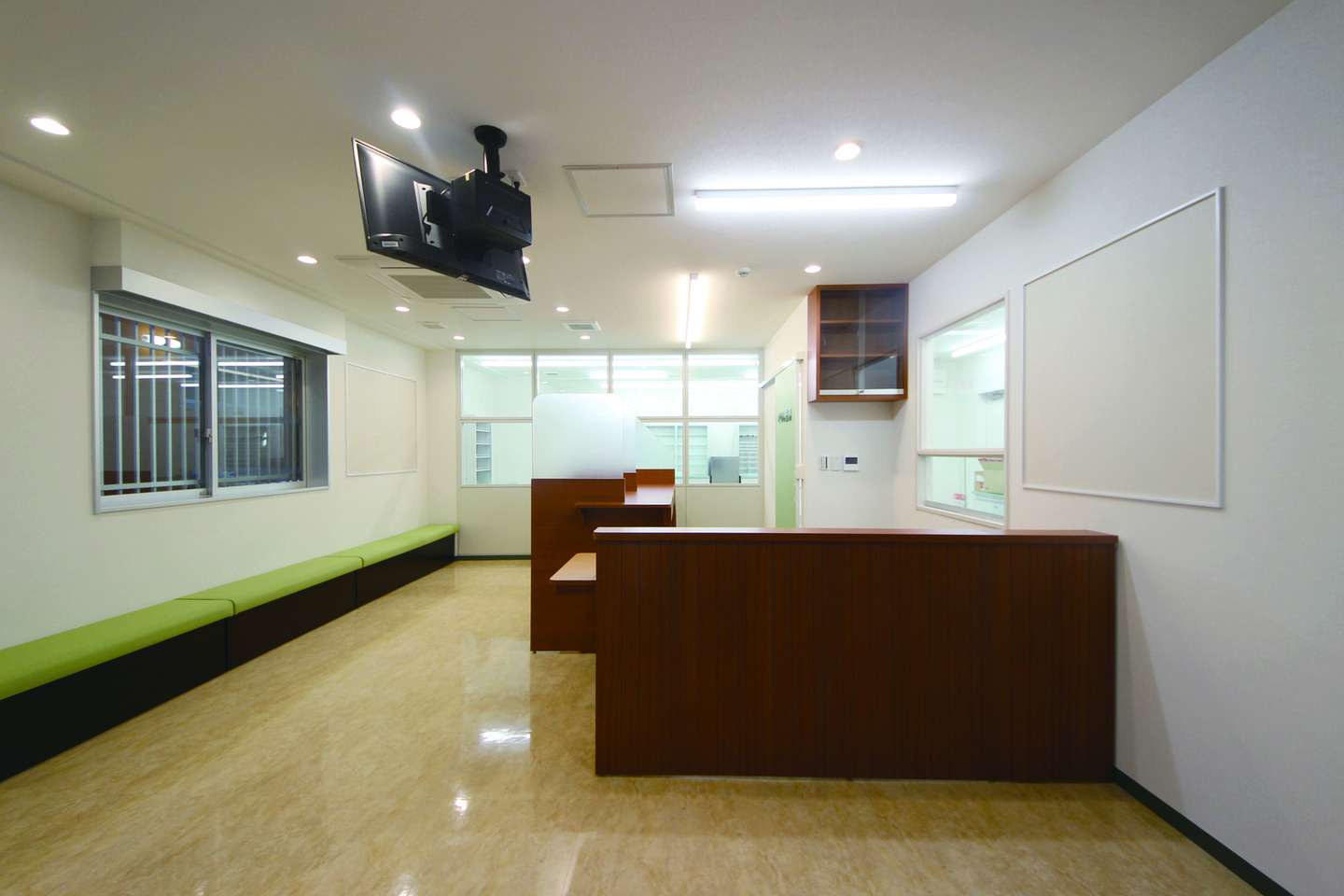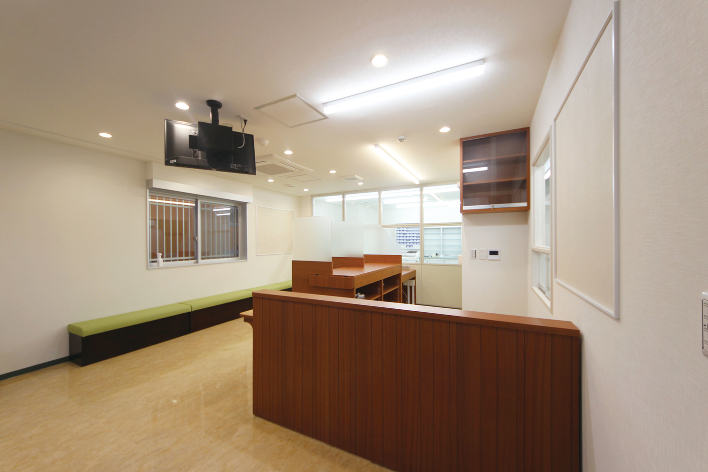 調剤室の建具と、待合ソファにモスグリーンを採用し、統一感を持たせました。