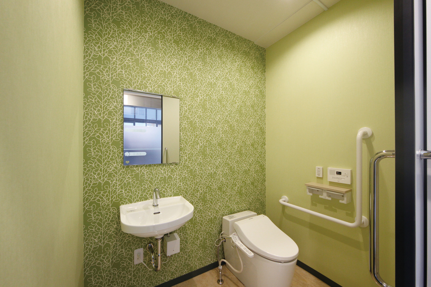 トイレには、グリーンのクロスと、撥水・抗菌作用のあるアクセントクロスを使用し、機能性も兼ね備えた、コンセプチュアルな空間になりました。