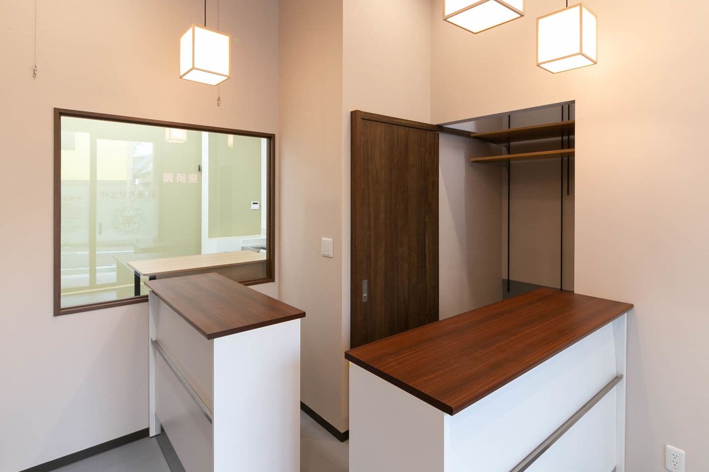 アクセントカラーには、薬局のイメージカラーであるモスグリーンを使用したことで、透し面から見える調剤室が、柔らかい印象になりました。