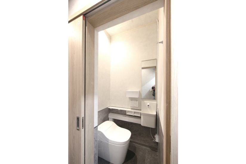 全体をグレーでまとめて統一感を出しながら、天井には木目を採用し、少し抜け感のある、親しみやすさを取り入れました。