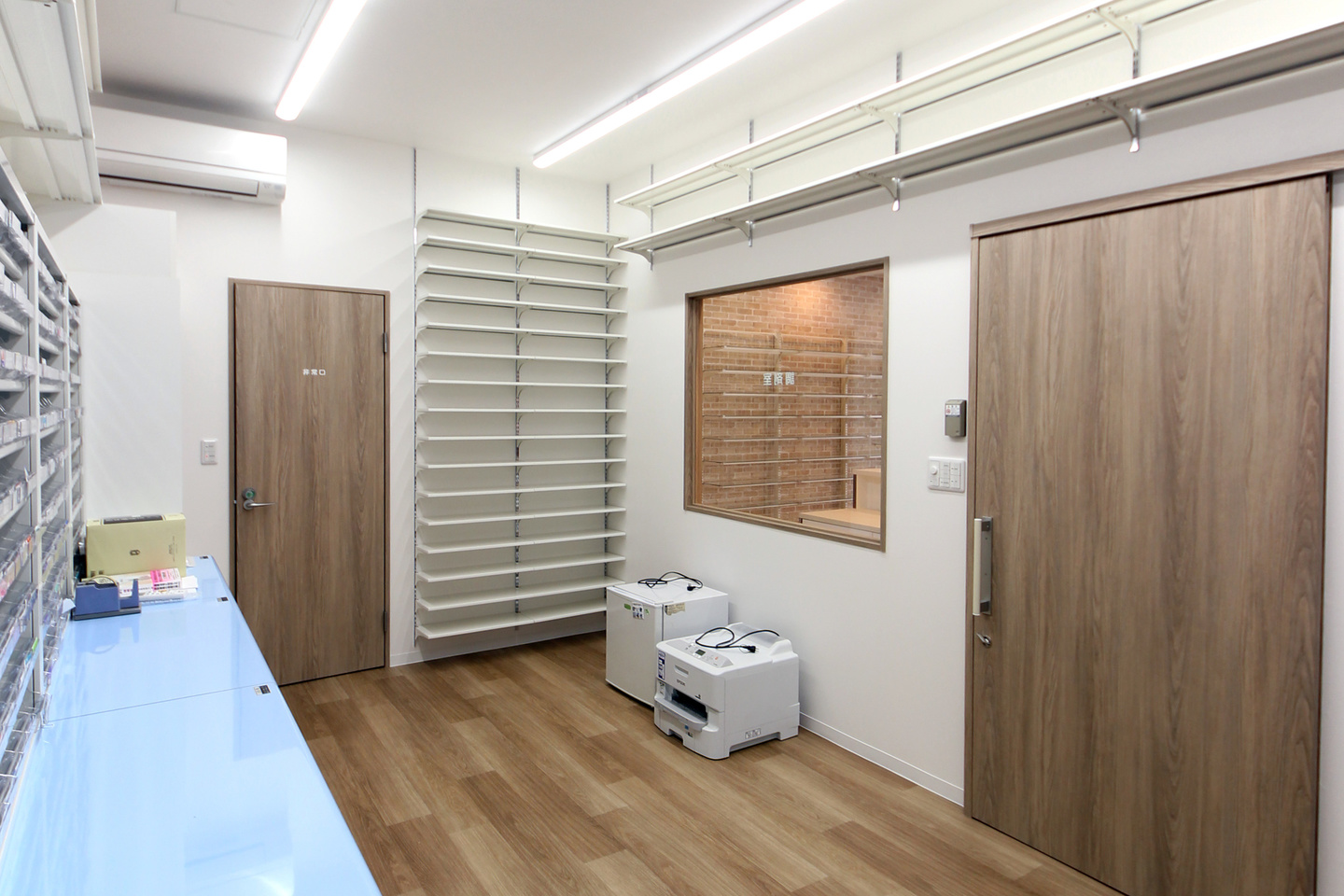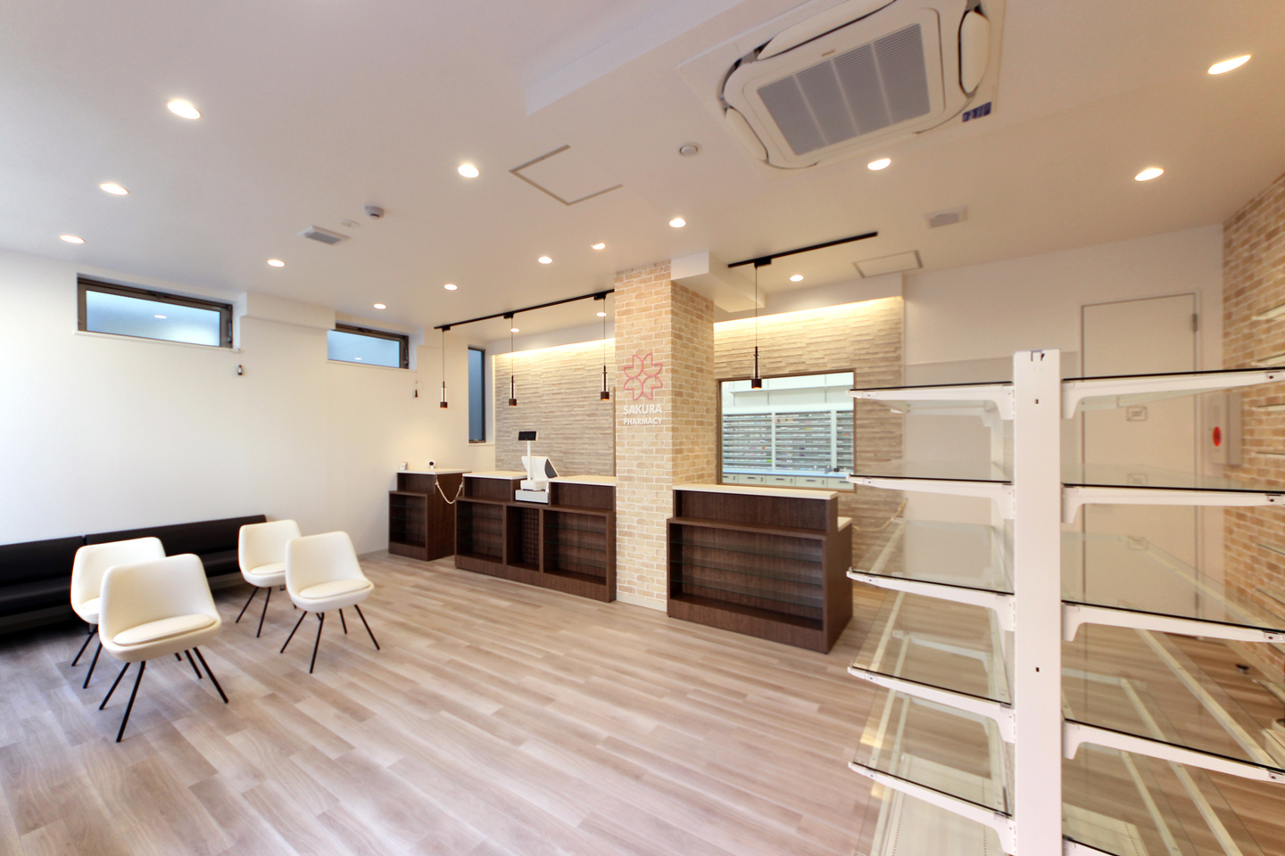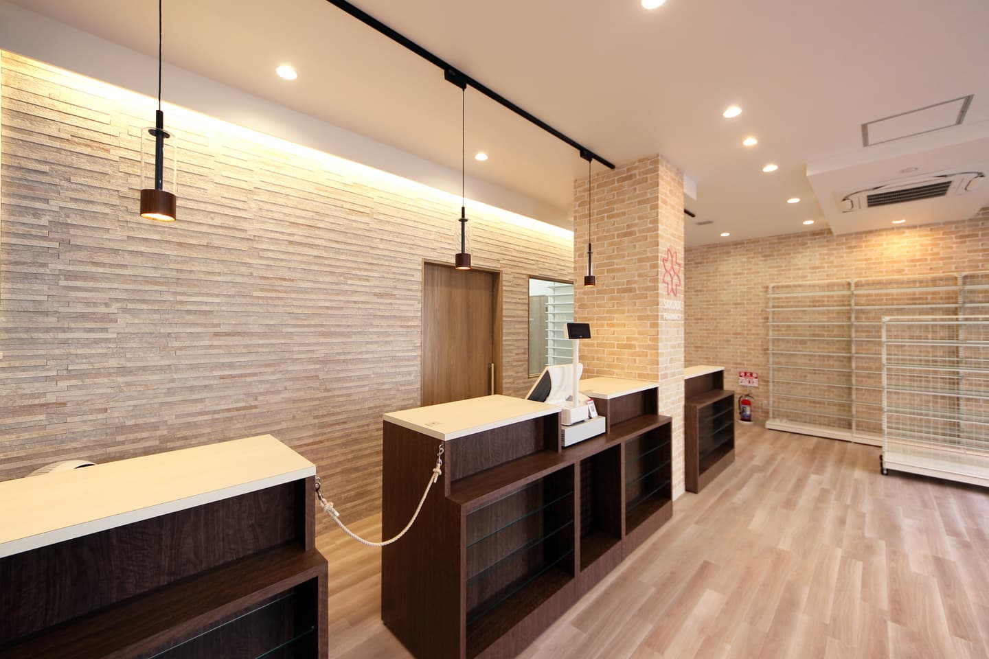 こだわりのあったレンガ調のクロスはOTCコーナーに使用し、ユニバーサルダウンライトを組み合わせて温かみのある雰囲気を演出しました。