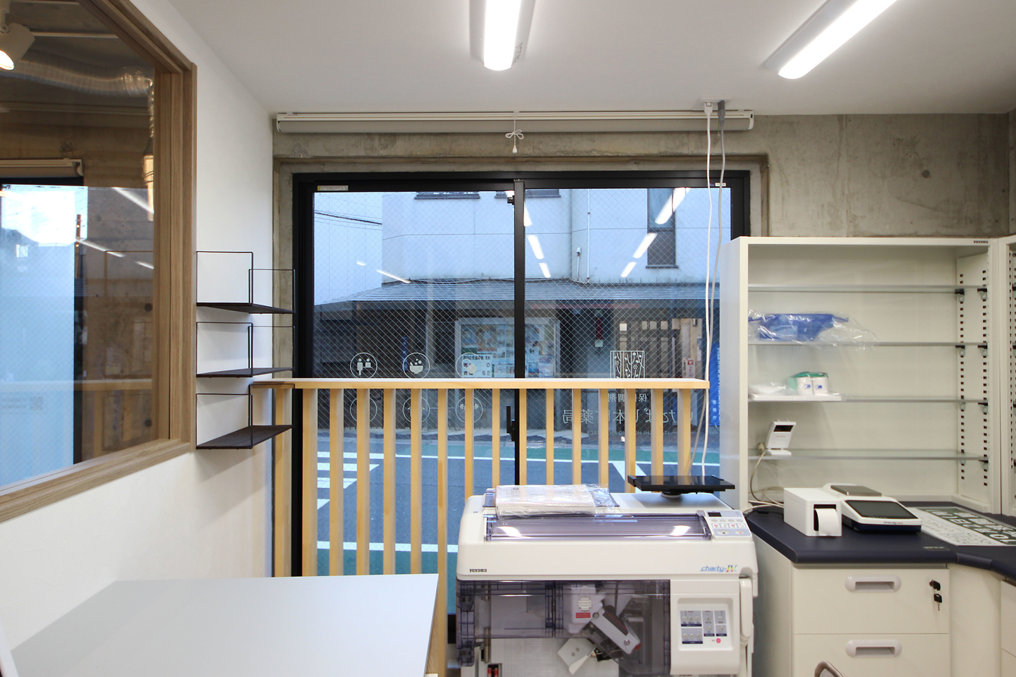 RC打ち放し仕上げなので、調剤室の天井仕上げ、投薬カウンターの配置などを検討しながら、RC打ち放しを活かした仕上げをご提案いたしました。