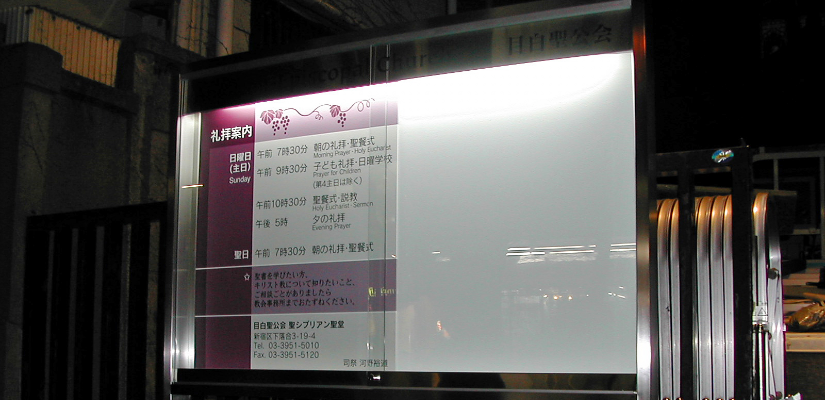 教会看板や掲示板、教会のサイン計画、光る十字架など、多くの経験と実績から さまざまなご提案をいたします。 光る十字架では「グロリア・クロス」というLEDを用いたオリジナル商品をご用意。 さまざまなサイズやコストに対応することができます。 ch0502