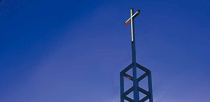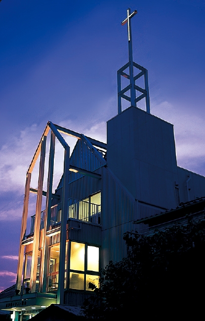 長津田キリスト教会では、塔屋部分に大型の光る十字架「グロリア・クロス」を 設置させていただきました。 建築デザインに調和したデザインで光り、教会へ導きます。 ch9810