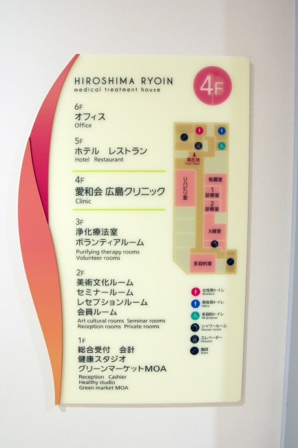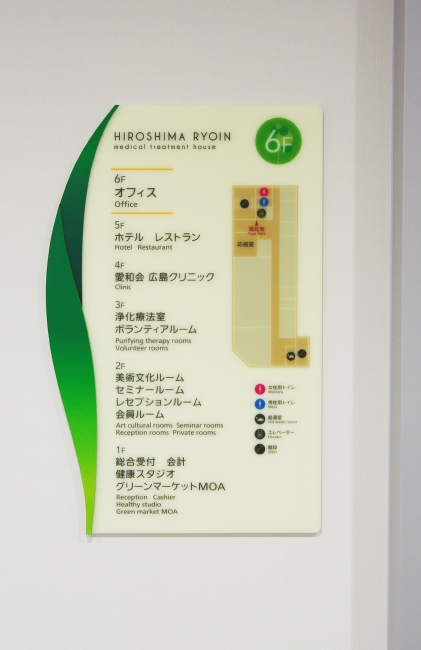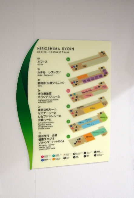 広島平和記念公園近くに位置する統合医療施設の看板・サイン計画・工事。 「生きる力をあなたに」をファシリティ・コンセプトとしており、 サインのデザインは生命の息吹を感じるようなイメージを作るために、 植物の葉をグラフィック要素として取り入れたサイン計画としている。 md1102