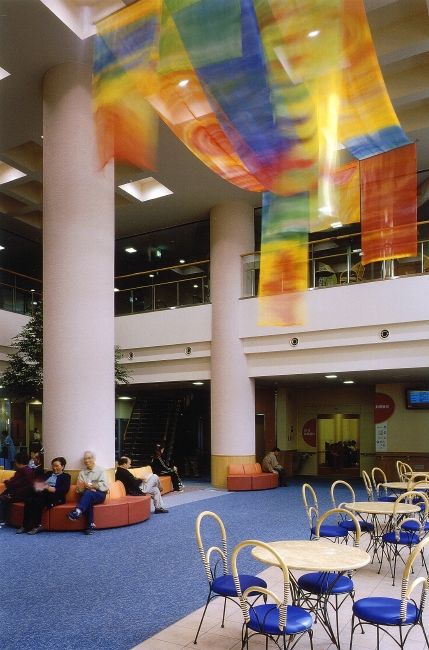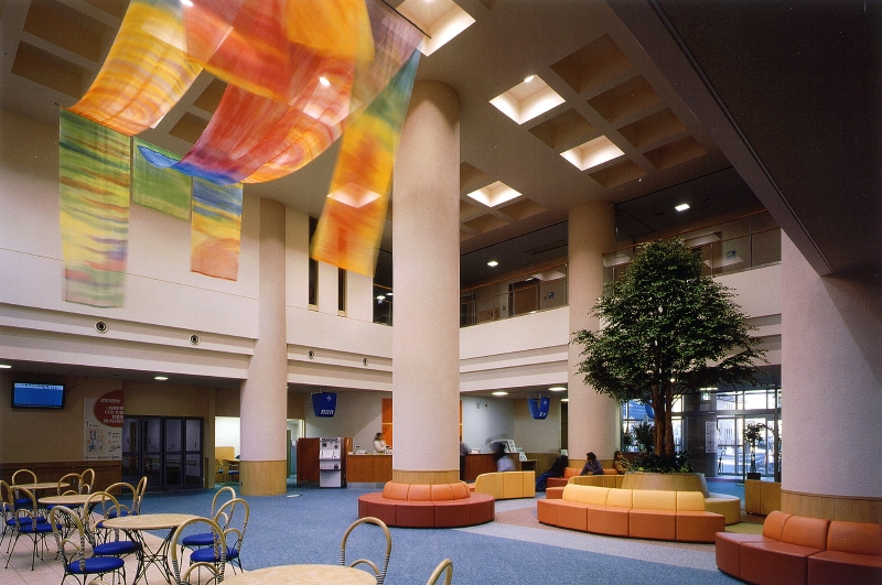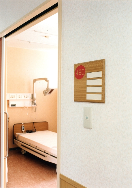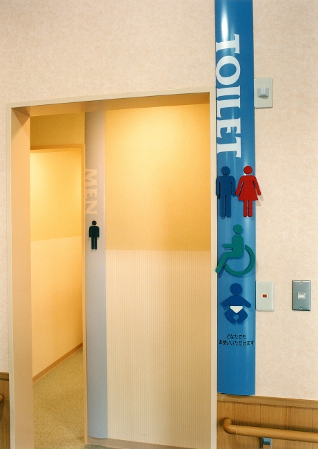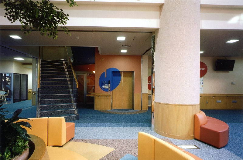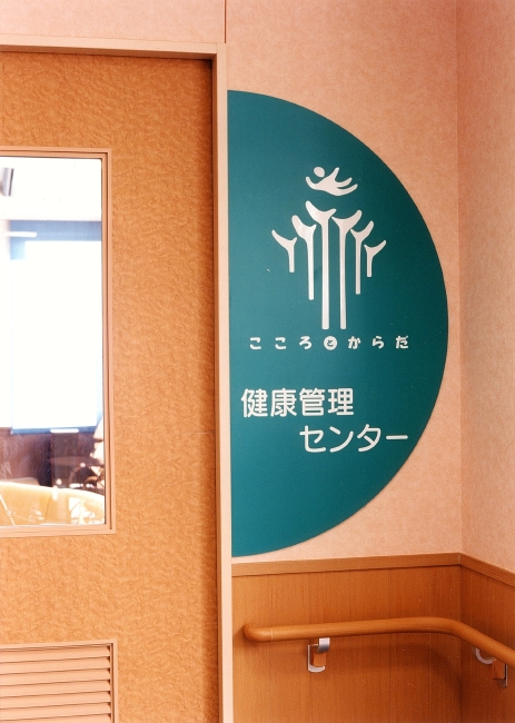 空間と響き合うボリューム感のあるサイン 堀江病院の全体コンセプトは『時節-とき-のリズム』 明るく開放的な建築のなかで、インテリアとサインがリズミカルに、カラフルに展開し、 訪れる患者さんを励まし、回復へと導いていくストーリーを描いた。 サインが空間と調和するのではなく、空間と響き合うようにと、大きく、厚く、明るく、 存在感のあるサインを目指した。 md0110