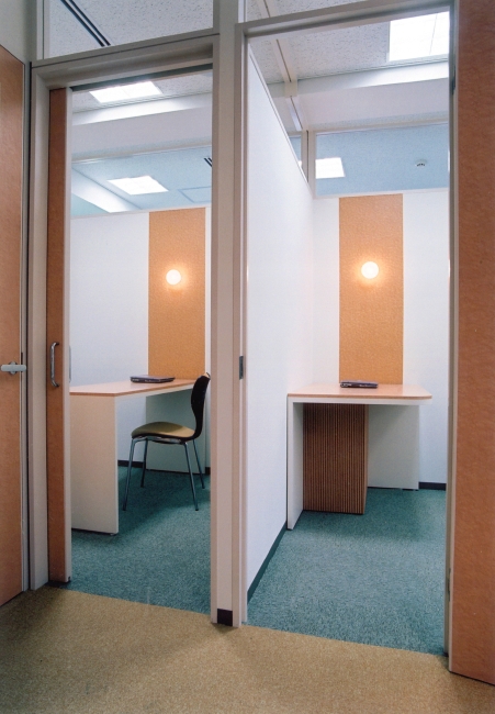 薬剤師が研修のために利用する教育研修施設。 研修ルームとしての固いイメージを取り除くため、木の質感を多く取り入れ、 落ち着いたあたたかみのあるインテリアに仕上げました。 md0405