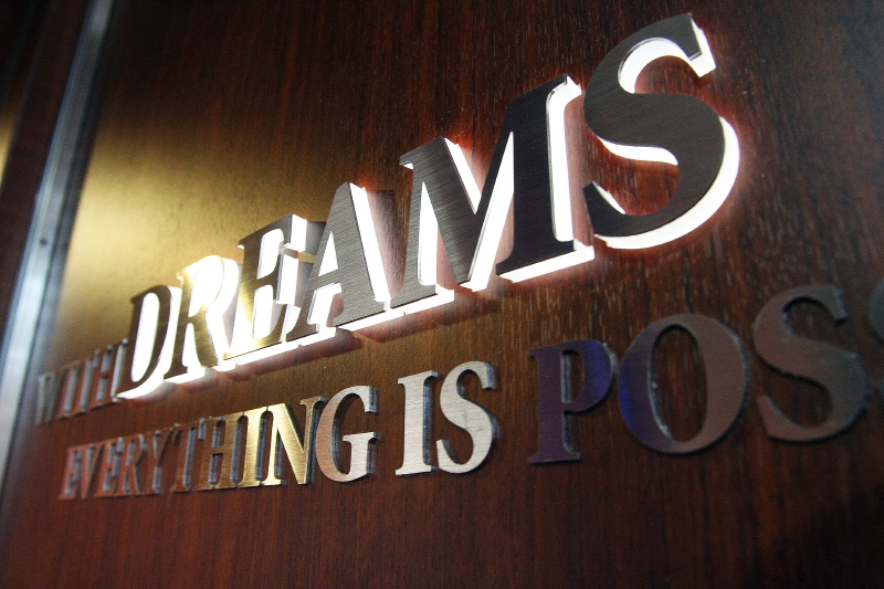 特殊な加工を施した文字が他ではない立体感と奥行きを出し、空間をより魅力的に