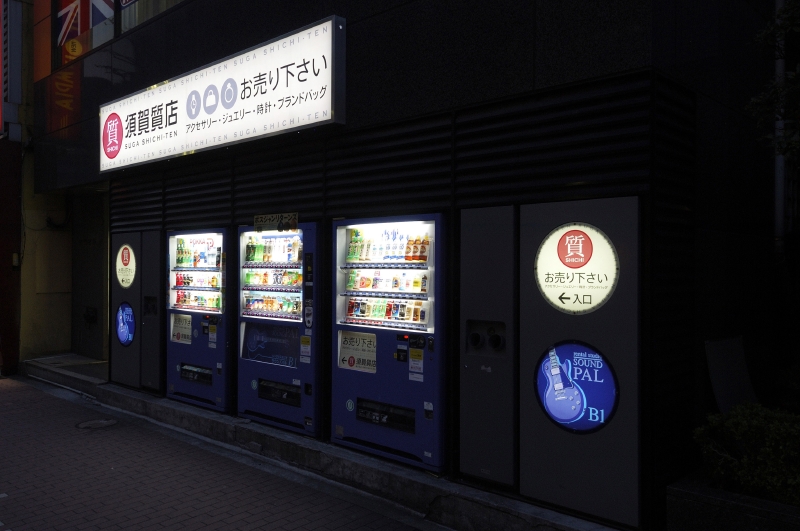 自動販売機も看板としてサイン計画に組み込むことで、ビルとしての顔を損なわず、