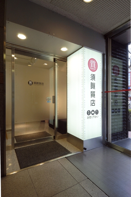 須賀質店様では、看板類を総合的にデザインしたサイン計画と、内装・インテリアを