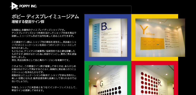 この壁面サイン群は、ショップ内の環境を活性化し、来訪者とショップとのコミュニケーションを図る
